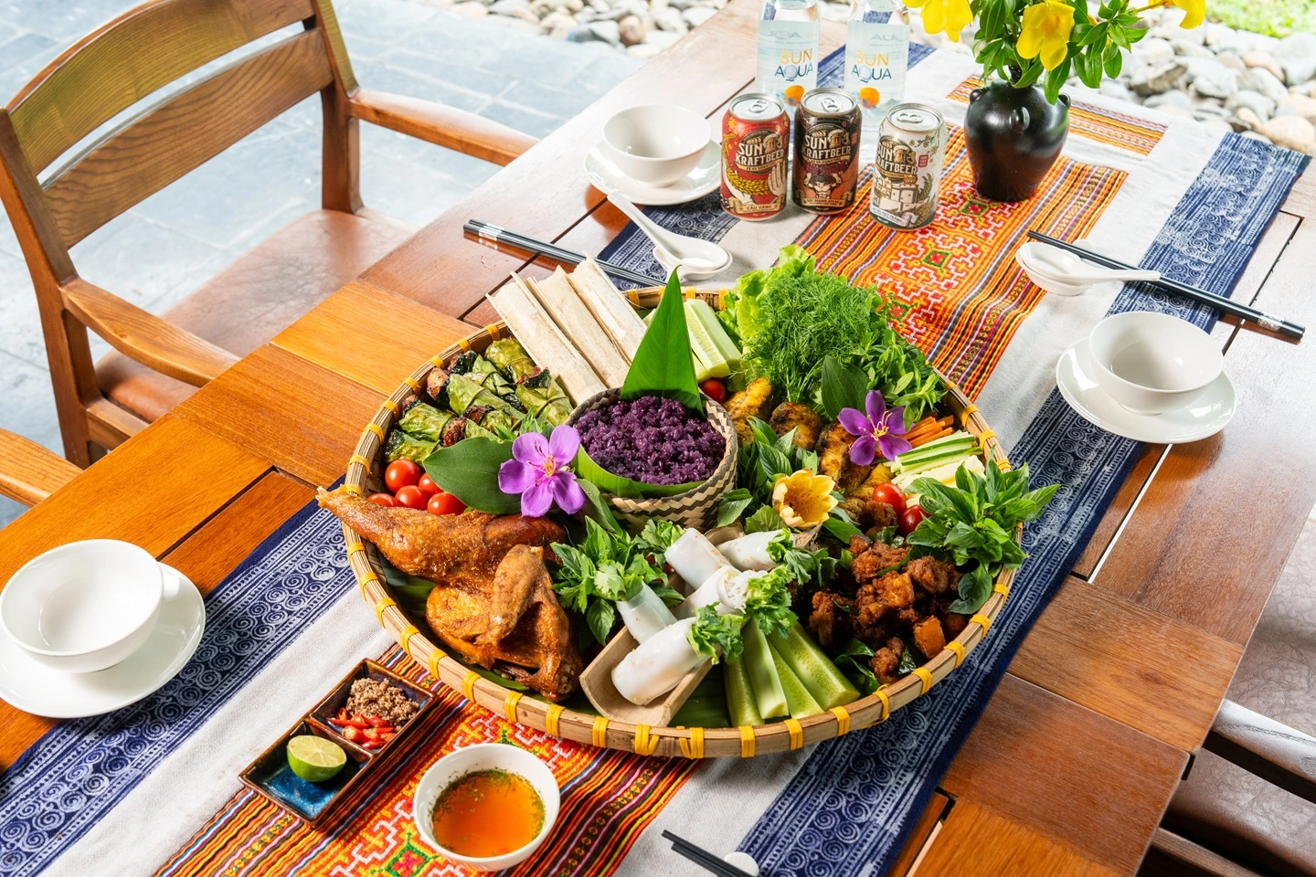 NÓN Restaurant serves specialties from Hoa Binh, including grilled stream fish, wild boar, forest vegetables, and bamboo tube rice (com lam). The cozy space reflects the warm and authentic Muong cultural atmosphere.