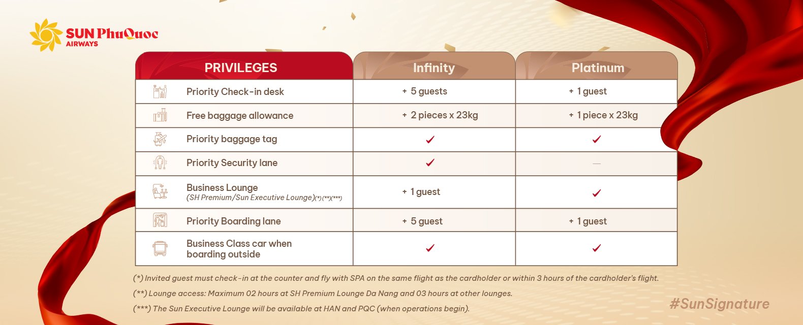 Sun PhuQuoc Airways understands that your distinguished status is proof of your dedication and achievements. To ensure your prestige continue uninterrupted, we are proud to introduce the Sun Signature program - “Prestige Intact, Privileges Aligned”