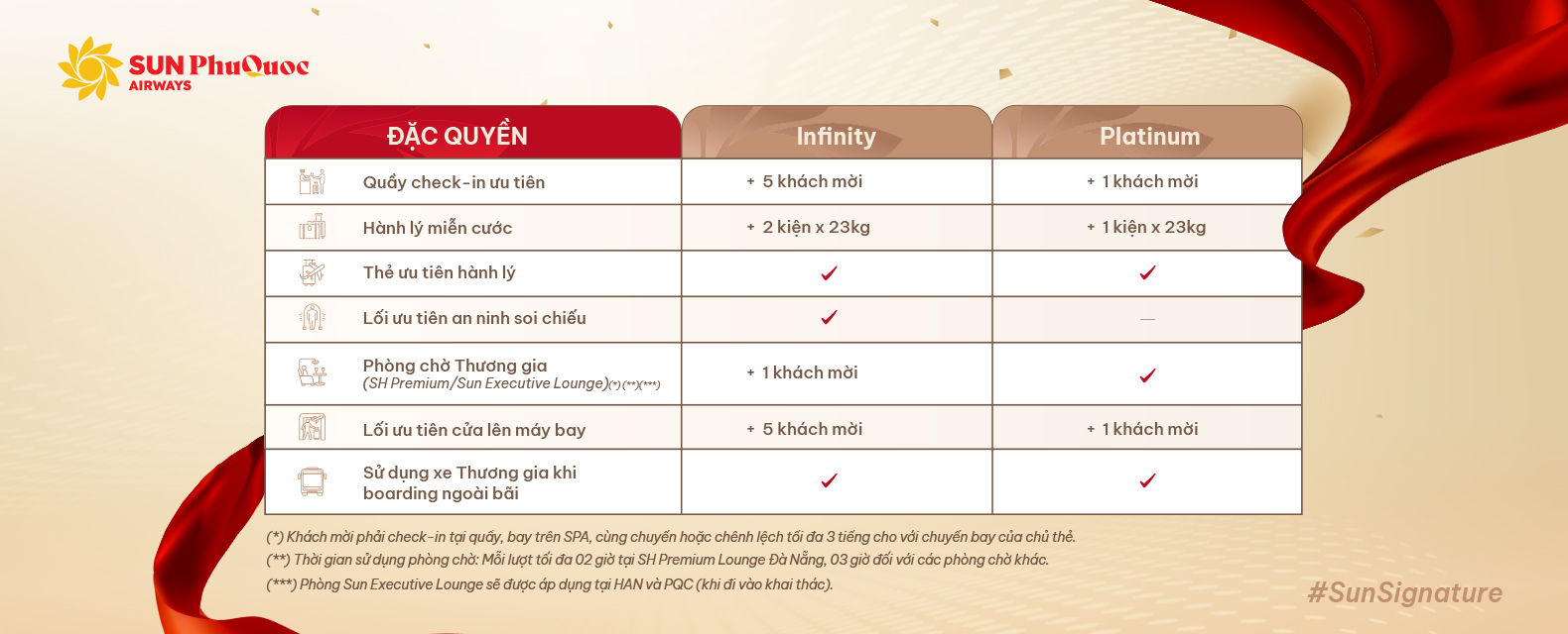 Sun PhuQuoc Airways thấu hiểu rằng, đẳng cấp của Quý khách là thành quả của một hành trình tích lũy dài lâu. Để hành trình ấy không bị gián đoạn, chúng tôi trân trọng giới thiệu chương trình Sun Signature - “Giữ vẹn đẳng cấp, Quyền lợi song hành”.