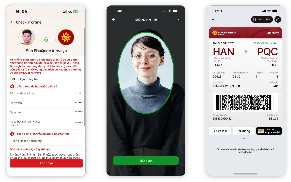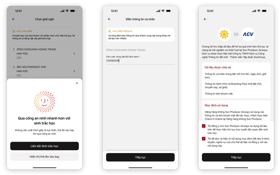 Thực hiện đồng ý chia sẻ thông tin với Sun PhuQuoc Airways, thực hiện quét mặt, thẻ lên tàu bay có đánh dấu “Đã liên kết sinh trắc họckhi thủ tục hoàn tất.